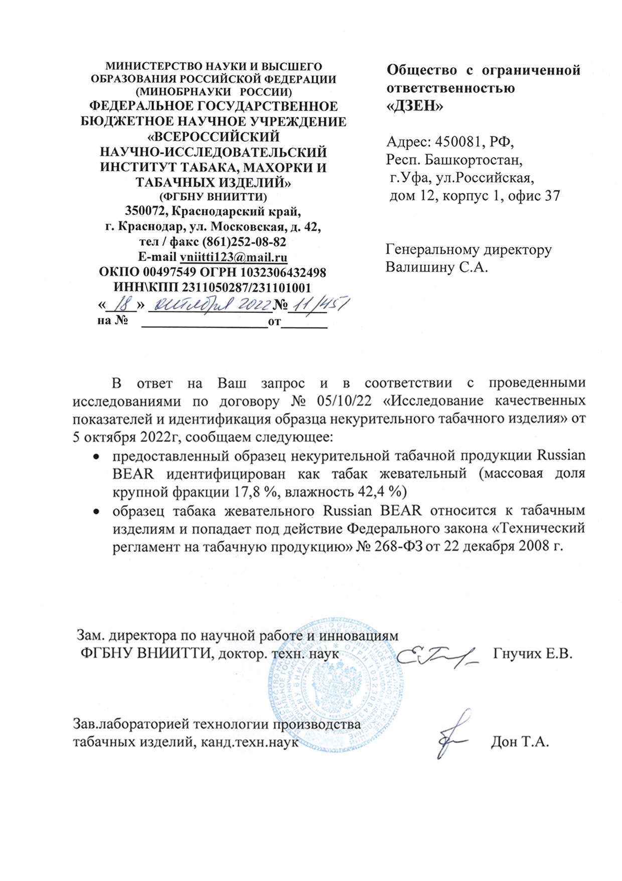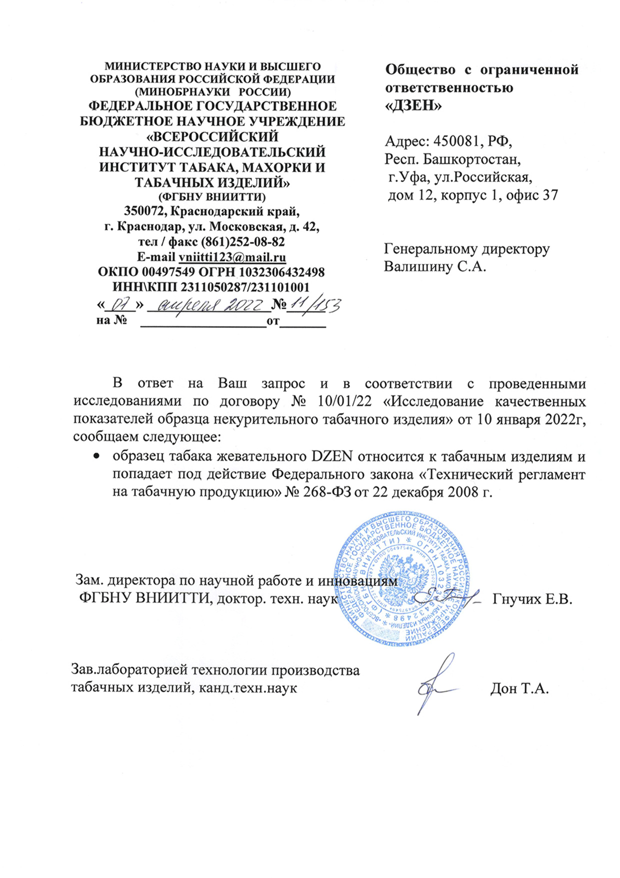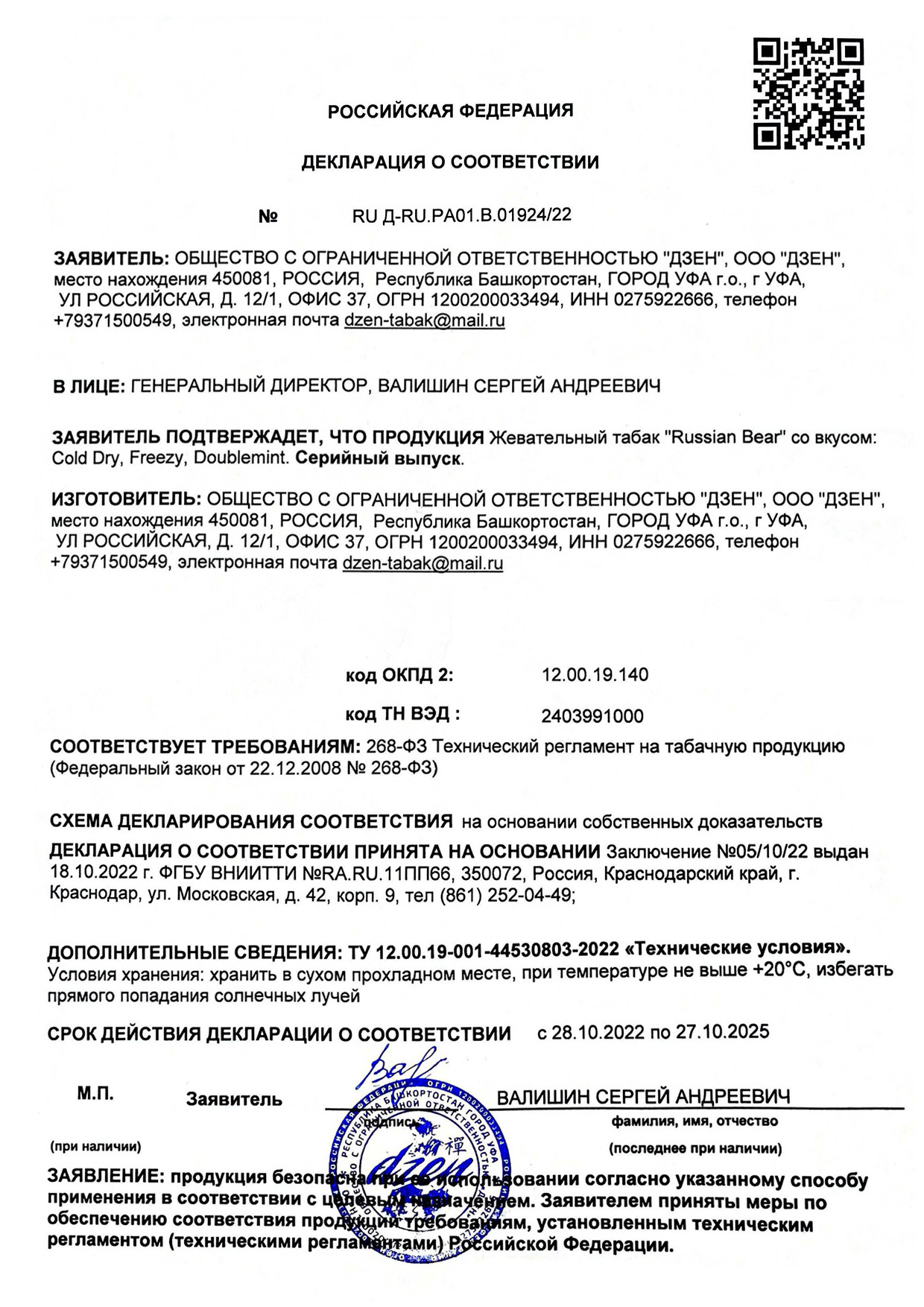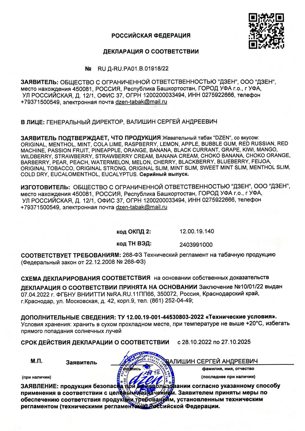 Вся продукция производственной компании ООО «Дзен» зарегистрирована в национальной системе маркировки «Честный знак». На неё получено заключение об исследовании качественных показателей от Всероссийского научно-исследовательского института табака и махорки и табачных изделий (ФГБНУ ВНИИТТИ). А также официально внесена в реестр Федеральной налоговой службы. На всю продукцию нанесены акцизные марки и коды системы маркировки «Честный знак».